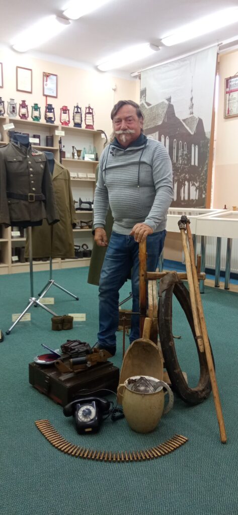 17.09.2025 w naszej placówce gościliśmy Pana Mieczysława Barysa, który co roku przywozi do nas różne eksponaty historyczne. Po ostatniej wizycie nasze zbiory powiększyły się o następujące eksponaty militarne: ładownica do karabinu Mauser, peryskop radziecki, skrzynka na amunicję, pas nabojów, granat ręczny, szabla, lornetka oraz niemieckie odznaczenia wojskowe.