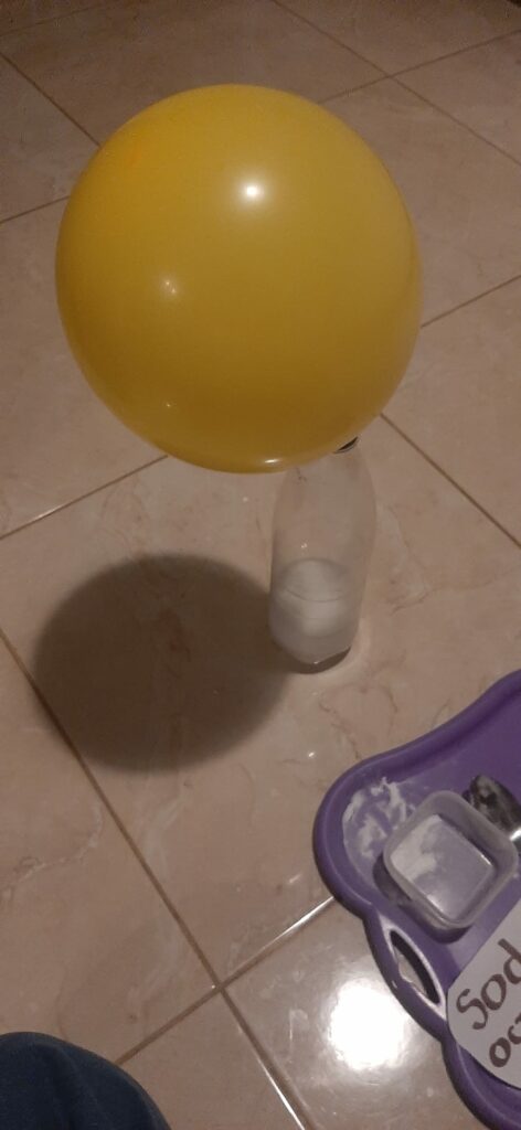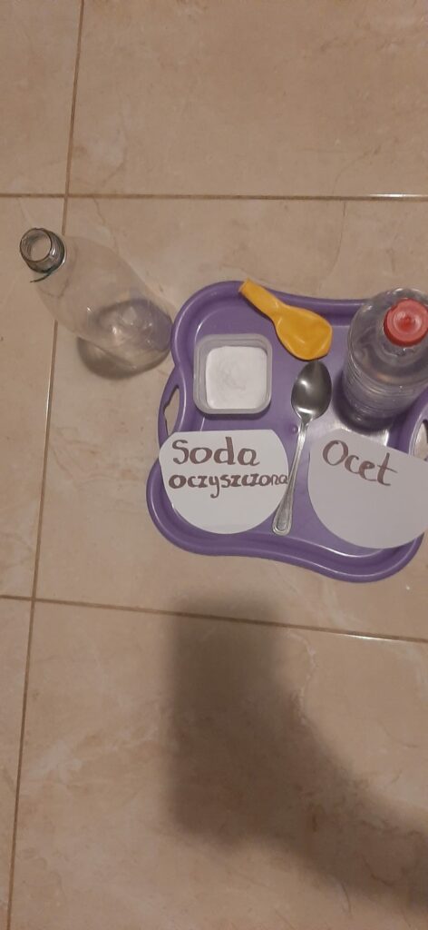 2. Reakcja octu z sodą oczyszczoną – do butelki wsypano sodę oczyszczoną, a następnie