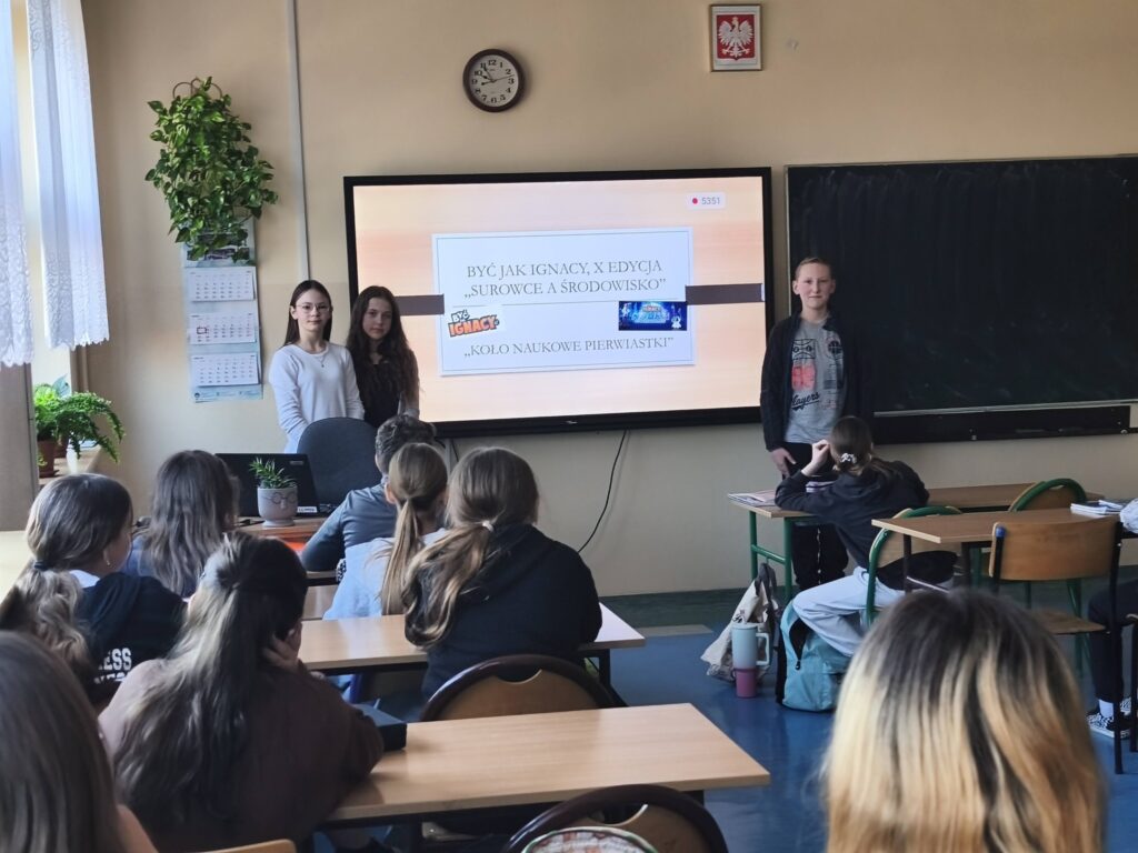 W dniu 17.02.2026r. uczniowie Szkolnego Koła Naukowego „Pierwiastki” przygotowali prezentację multimedialną dotycząca działalności kopalni i możliwości rekultywacji terenów pokopalnianych. Przeprowadzili prelekcję dla swoich koleżanek i kolegów z klasy 6a. Była to realizacja tematu nr 5 „Surowce a środowisko”.