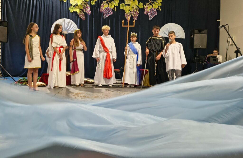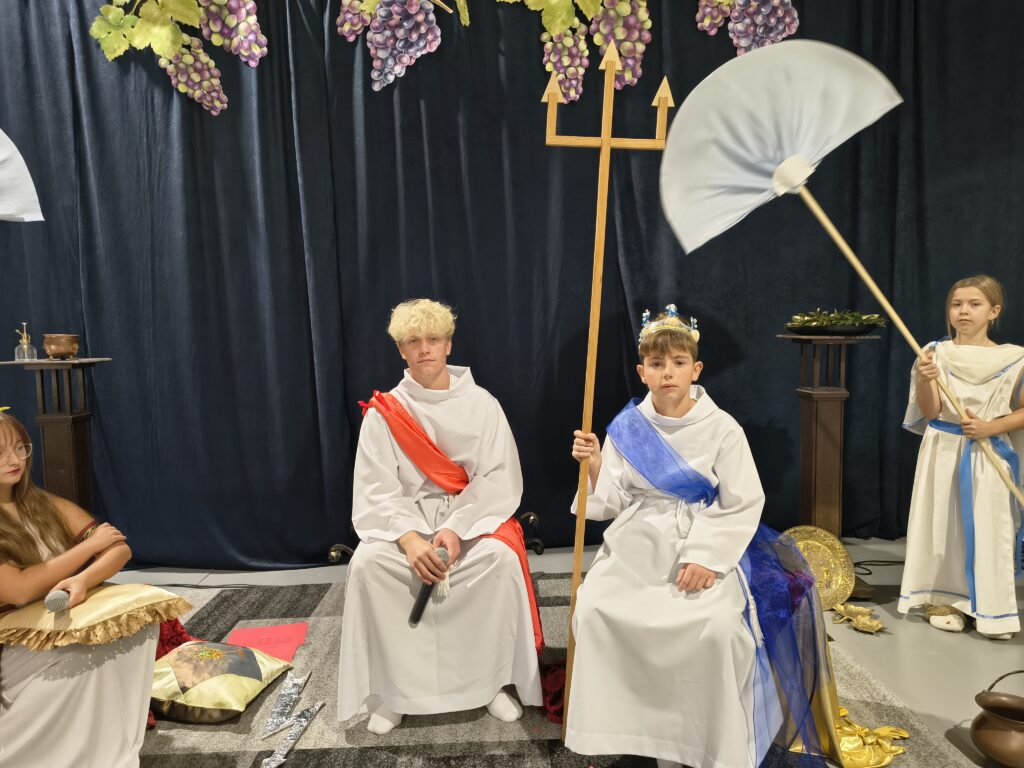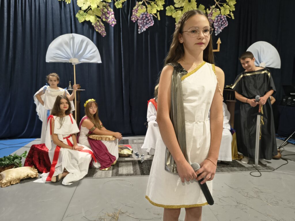 Po części oficjalnej uczniowie klas 3b, 6a, 8a oraz 8b zaprezentowali spektakl pt. „Mit o tym, jak belfer świat przed głupotą ocalił”, przygotowany na podstawie autorskiego scenariusza Pań Doroty Stono i Danuty Sygnarowicz. Przedstawienie w sposób humorystyczny, a zarazem refleksyjny ukazało misję nauczyciela – przewodnika po świecie wiedzy i mądrości.